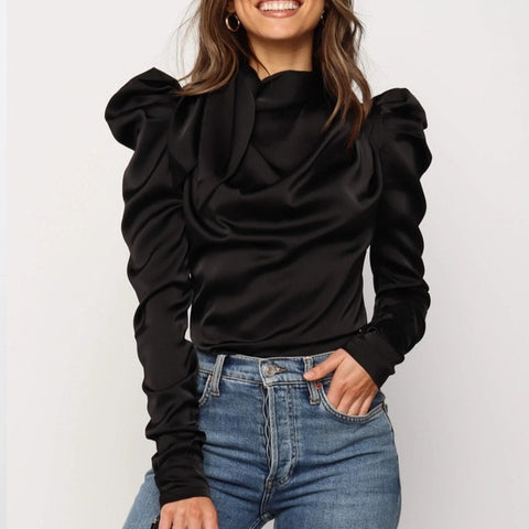 Brand Name: MeihuidaMaterial: PolyesterClothing Length: RegularDecoration: NoneFabric Type: SatinPattern Type: SolidSleeve Length(cm): FullModel Number: Blouses & ShirtsSleeve Style: Puff SleeveCollar: Turn-down CollarStyle: Casual