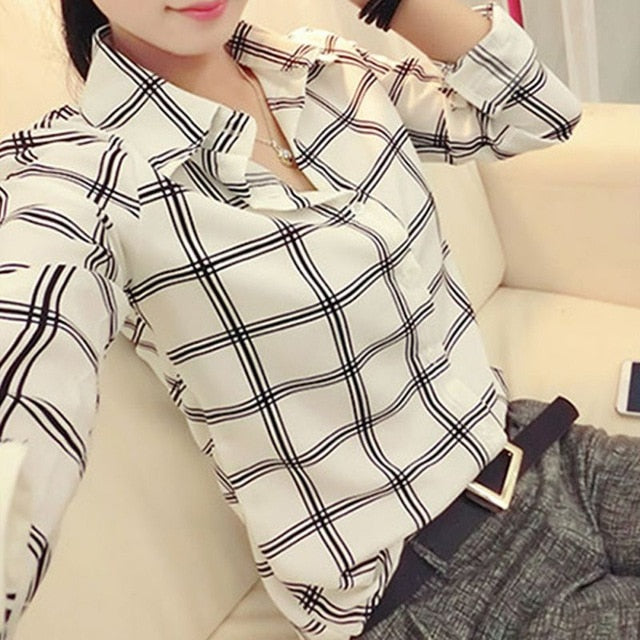 New Summer Turn Down Callar Shirts Women Casual Tops Women's Long Sleeve Plaid Blouse Clothing vadim*